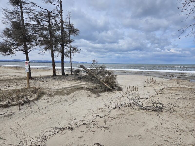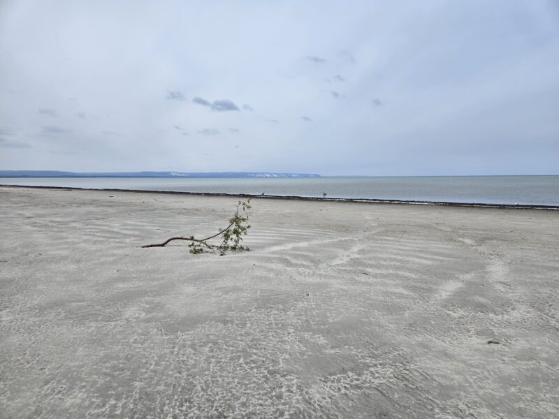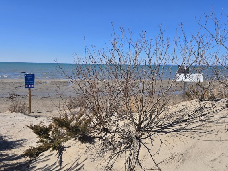 Sunday, April 6th, 2025 – Whenever there are northwest winds, the kite servers are out at Beach area 6.Monday, April 7th, 2025 – These are properties that I walk by every day just east of 30th street before the beach 4 entrance. The blue stairs go up to a small beachfront swimming pool that must be a blast in the summer months.Tuesday, April 8th, 2025 – We had fresh snow Tuesday, reminding us that it’s not summer yet! The rocks offshore are still covered with frozen ice.Wednesday, April 9th, 2025 – I’m still seeing damage from last week’s ice storm up and down the beach. This picture was taken at the provincial park at Beach area 5.Thursday, April 10th, 2025 – A lonely tree branch blowing along the beach.Saturday, April 12th, 2025 – I rarely use this beach entrance (52nd street) near Beach area 6.