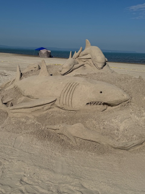 July 6th, 2025 – An awesome sand sculpture of a shark and dolphins at Beach Area One.