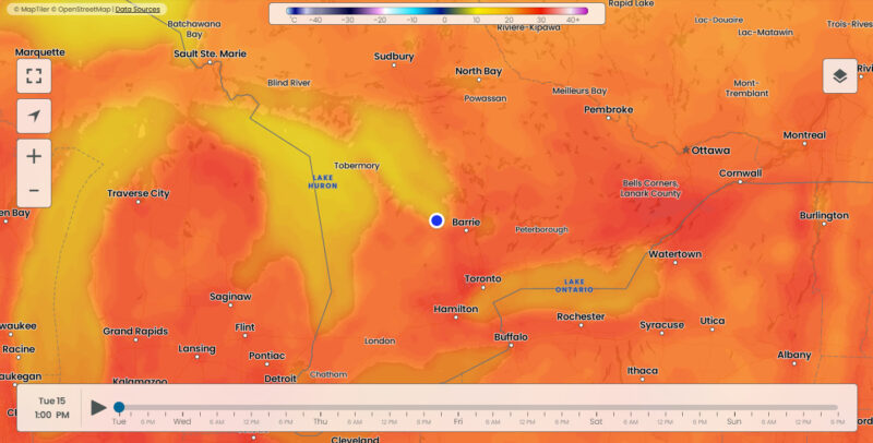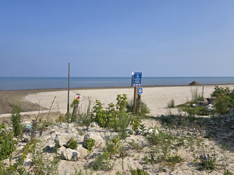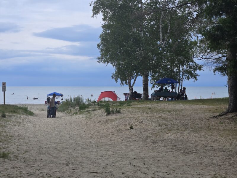 Sunday, July 13th, 2025 – the Volleyball tournament at Beach one was continuing on Sunday morning. The tournament had ~100 teams and roughly 750 players.Monday, July 14th – the owners of these chairs headed out for a swim!Tuesday, July 15th, 2025 – Walking east on Shore Lane approaching the entrance to Beach area 5.July 15th, 2025 – You know you’re in a hot spell whe the weather map looks like this!Wednesday, July 16th, 2025 – Entering the beach near 30th street just west of Beach area 4. You can see where the beach has been graded by the different sand colors.Thursday, July 17, 2025 – We experienced a welcome change in the weather on Thursday, with several consecutive days of sunshine. It was nice to feel strong winds from the northwest and enjoy cool nights for sleeping.Friday, July 18th, 2025 – Looking east from the roadway, cross the Beach area 5 parking lot. This is a different route than I normally take crossing Beach 5.Saturday, July 19th, 2025 – Overcast weather did nothing to diminish the number of people enjoying the beach. This picture was taken at one of many footpaths in Beach Area 5.