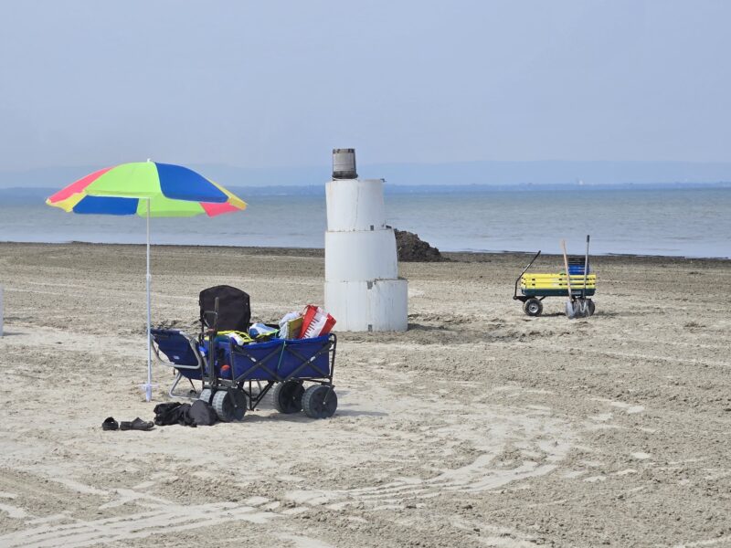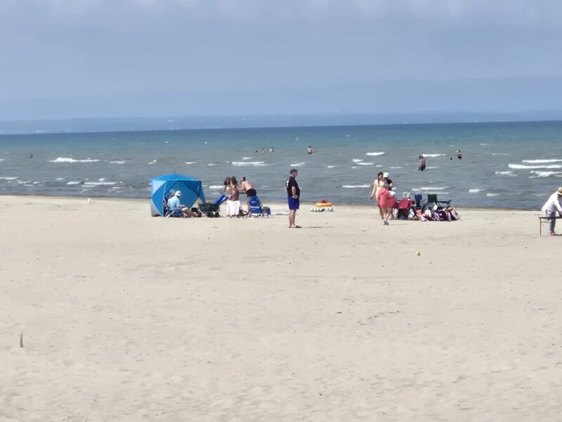Sunday, July 27th, 2025 – Walking near Beach One on a Sunday morning as the fair sets up.Monday, July 28th, 2025 – Looking west from the exit to Beach Area 5. This pictures was taken at 30th street looking west.Wednesday, July 30th, 2025 – Crowds enjoying the beach close to the August Civic Holiday.Thursday, July 31st, 2025 – This picture was taken just west of Beach Area 5. Someone brought cylindrical forms to pack Beach Sound into a tower. I had not seen this before.Thursday, July 31st, 2025 – On Thursday, I was greeted by new signs while walking down my regular trail from the Recplex to Shore Lane. It’s great to see there – unfortunately they didn’t last more than a couple of weeks.Saturday, August 2nd, 2025 – Family friends Darryl and Ron performing at the Nesbitt’s 60th anniversary bash in North Bay,