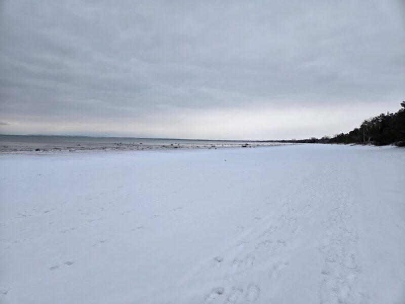 Thursday, December 5th, 2025 – Hwy 26 was closed today due to snow squalls. This picture shows snow drifting across Shore Lane during a later afternoon walk near Beach Area 3.