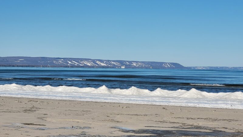 The ice is receeding from the beach much earlier than prior years. By way of comparison, this is a picture