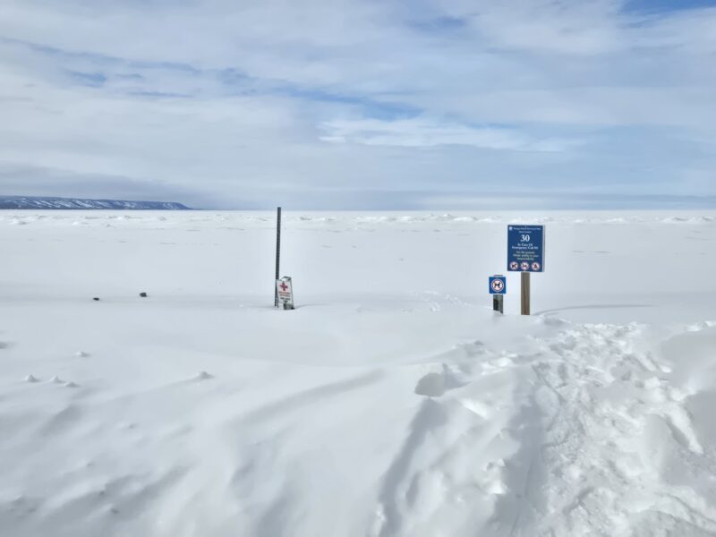 Thursday, February 12th, 2026 – Nottawasaga Bay to the north is frozen solid. As this picture shows, the beach is passable only with snowshoes. This time of year, I walk along Shore Lane and venture to the beach only when there are packed snowmobile trails.