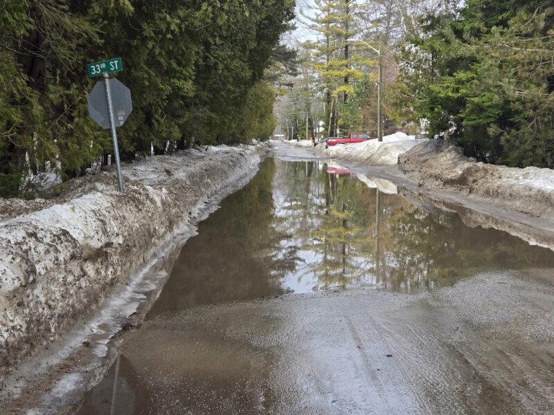 We finally had some above-seasonal days this week, leading to a rapid melt and flooding. The featured picture for this post shows Shore Lane looking west from the trail heading to the Recplex. The street was impassible on foot with puddles several inches deep that extended for two blocks.